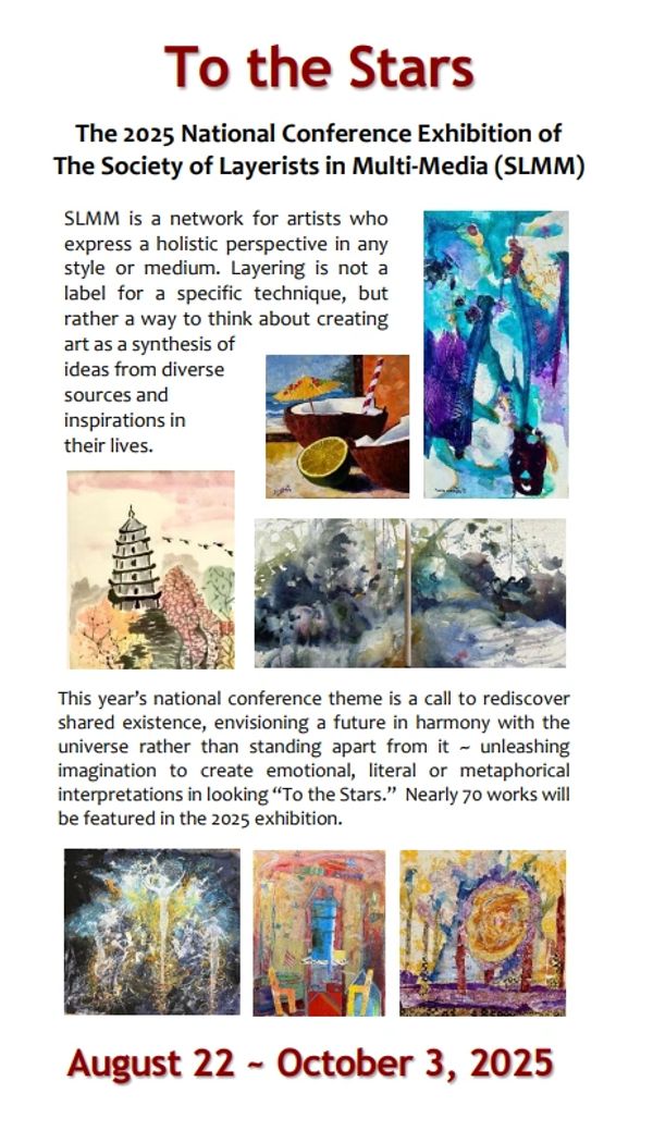 To The Stars is the theme for the 2025 national exhibition and conference, being considered the perfect catalyst for the Society of Layerists in Multi-Media members to unleash their creativity. Their layered artwork reflects an imaginative exploration of our interconnected, holistic existence. Viewers are invited to see each piece as a vision of a future in harmony with the universe- one that reminds us the journey begins within. We dedicate this exhibition, TO THE STARS, to the late Mary Carroll Nelson, SLMM Founder.